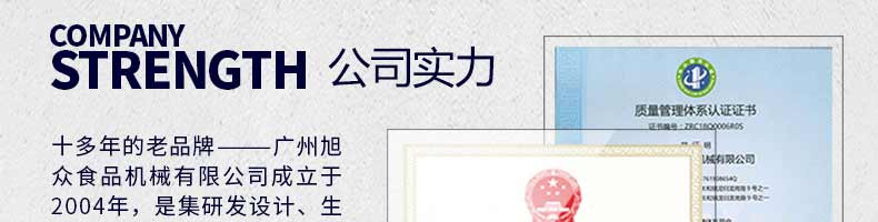廣州旭眾食品機械有限公司是一家集科研開發(fā),生產(chǎn)設(shè)計,營銷服務(wù)為一體的現(xiàn)代化生產(chǎn)企業(yè)。現(xiàn)代化生產(chǎn)車間,精湛制造技術(shù),所產(chǎn)機械歷經(jīng)市場重重考驗,不斷贏得海內(nèi)外客戶的贊譽。