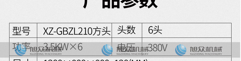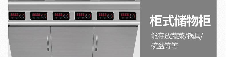 名稱XZ-GBZL210方形柜式電磁爐 電源380V 功率3.5KW×6 產(chǎn)量聯(lián)系銷售員 尺寸1200×800×800+120MM 重量聯(lián)系銷售員 規(guī)格頭數(shù):6頭 其他