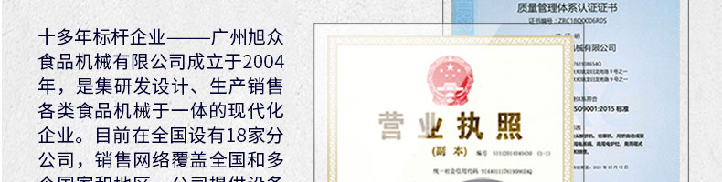 廣州旭眾食品機(jī)械有限公司是一家集科研開發(fā),生產(chǎn)設(shè)計(jì),營銷服務(wù)為一體的現(xiàn)代化生產(chǎn)企業(yè)?,F(xiàn)代化生產(chǎn)車間,精湛制造技術(shù),所產(chǎn)機(jī)械歷經(jīng)市場重重考驗(yàn),不斷贏得海內(nèi)外客戶的贊譽(yù)。