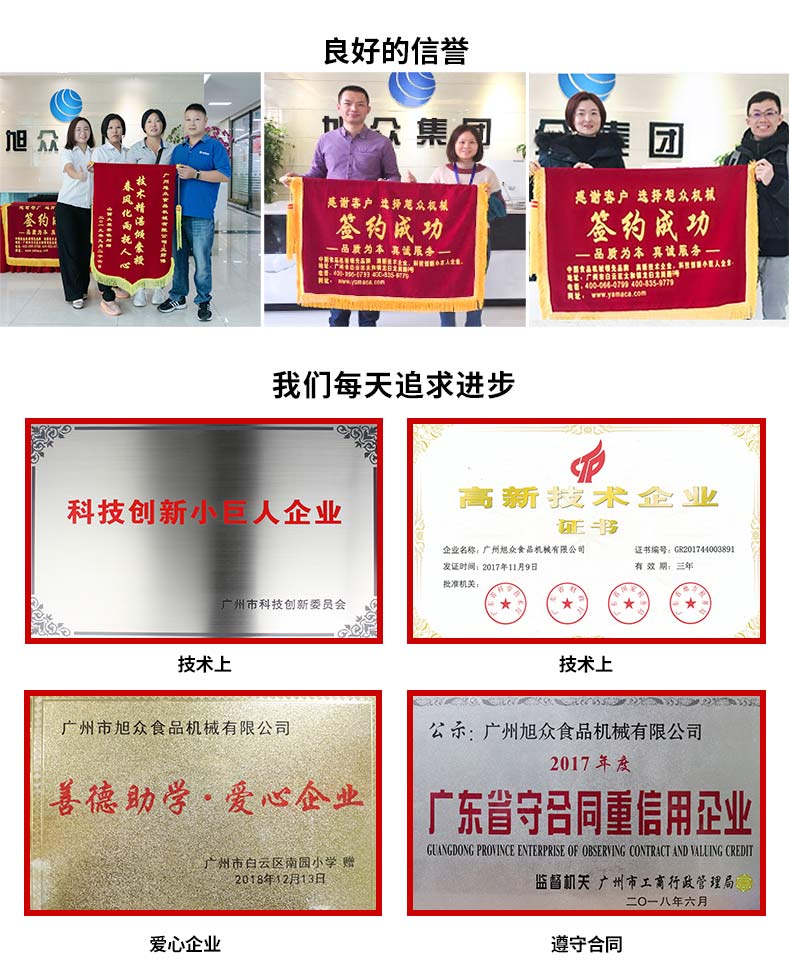 廣州旭眾食品機械有限公司是一家集科研開發,生產設計,營銷服務為一體的現代化生產企業。現代化生產車間,精湛制造技術,所產機械歷經市場重重考驗,不斷贏得海內外客戶的贊譽。