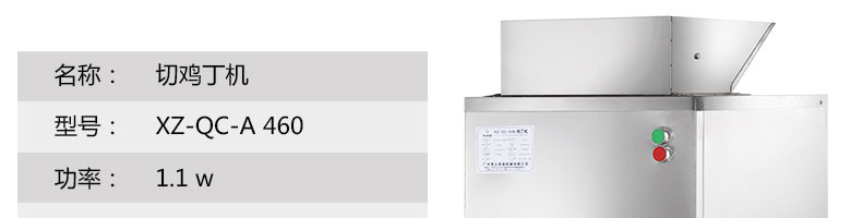 XZ-QC-A460切丁機,切雞丁機適合將帶軟骨的禽類,如雞、鴨、鵝、鴿、魚類等切成塊(丁)狀。本系列設備工作效率高,采用不銹鋼制作,美觀耐用,切割快速,少碎骨。