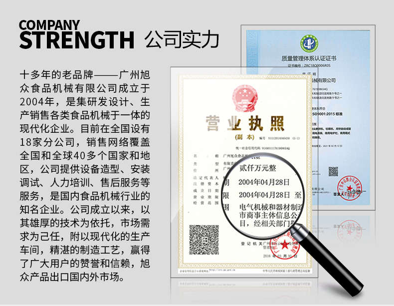 廣州旭眾食品機械有限公司是一家集科研開發,生產設計,營銷服務為一體的現代化生產企業。現代化生產車間,精湛制造技術,所產機械歷經市場重重考驗,不斷贏得海內外客戶的贊譽。