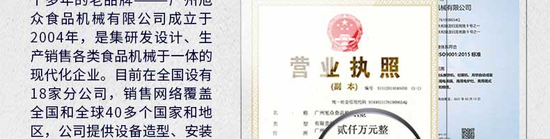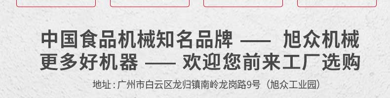 廣州旭眾食品機(jī)械有限公司是一家集科研開發(fā),生產(chǎn)設(shè)計(jì),營銷服務(wù)為一體的現(xiàn)代化生產(chǎn)企業(yè)。現(xiàn)代化生產(chǎn)車間,精湛制造技術(shù),所產(chǎn)機(jī)械歷經(jīng)市場重重考驗(yàn),不斷贏得海內(nèi)外客戶的贊譽(yù)。