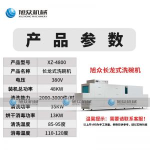 名稱XZ-4800長龍式洗碗機 電源380V 功率裝機總功率:48KW,清洗系統功率:35KW,烘干消毒功率:13KW 產量清洗能力:2000-3000件/時 尺寸4800X850X1630(mm) 重量聯系銷售員 規格清洗溫度:85-95C,消毒溫度:110-120C 其他清洗傳送帶:鷹勾齒、餐盤斜插式,清洗傳送帶:三缸三噴,22條噴臂清